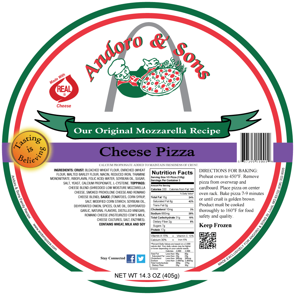 Andoro & Sons Pizza “Our Original Mozzarella” Pizza – a thin crust cheese pizza with Our Original Mozzarella cheese blend. It arrives frozen and fresh.