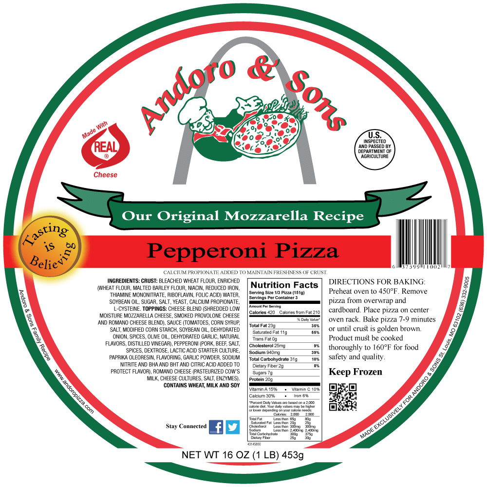 Andoro & Sons Pizza “Our Original Mozzarella” Pizza –  a thin crust  pepperoni pizza with Our Original Mozzarella cheese blend. It comes topped with our special pepperoni recipe.  It arrives frozen and fresh.