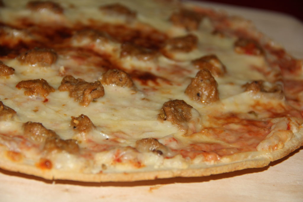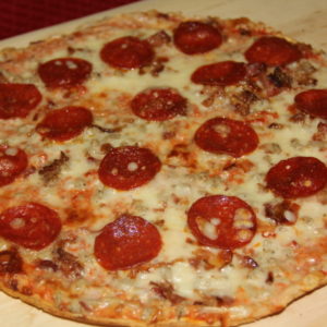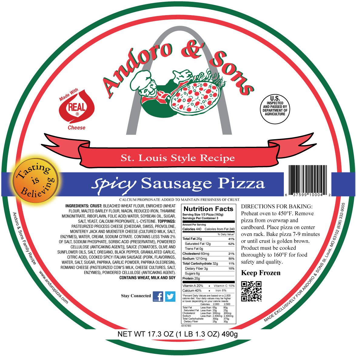 Andoro & Sons St. Louis Style Pizza… a thin crust Spicy Sausage Pizza with our unique 5 St. Louis Style Pizza Cheese blend.  It is our most recent addition, and becoming very popular.  Our Spicy Sausage is made specifically for Andoro & Sons.  It is a chunk sausage spiced with a little garlic!   Not overly spicy, but not recommended for a first date night!!  It arrives frozen and fresh.