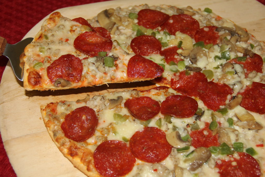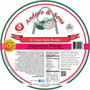 Andoro & Sons St. Louis Style Pizza- a thin crust pizza with our unique 5 St. Louis Style Pizza Cheese blend. It comes topped with sausage, pepperoni, mushrooms and green peppers.   It arrives frozen and fresh.   One of our customers favorites!!